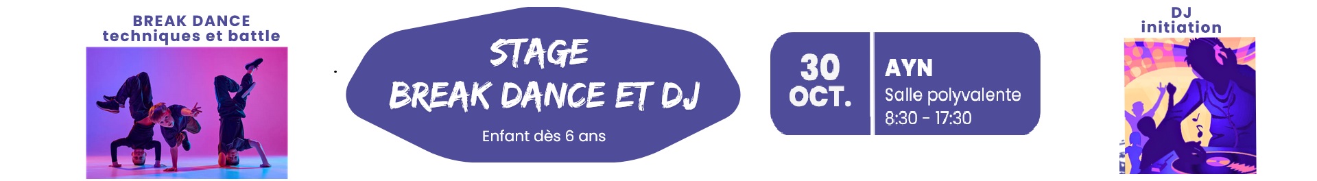 Un stage destiné aux enfants, dès 6 ans, pour leur permettre de découvrir les techniques de Break Dance, puis de les mettre en pratique lors de battles, et de s'initier au DJing.