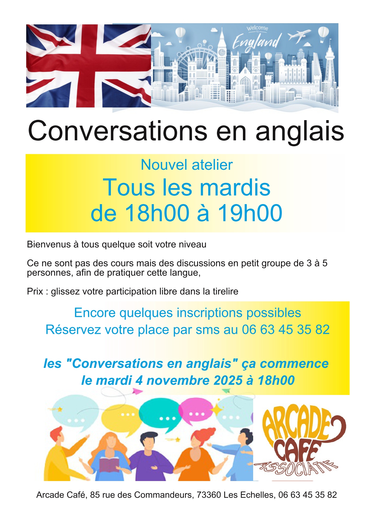 Bienvenus à tous, quelque soit votre niveau ! Ce ne sont pas des cours mais des discussions en petit groupe de 3 à 5 personnes, afin de pratiquer cette langue. Participation libre (une tirelire est là à cet effet) + adhésion à l'association obligatoire.