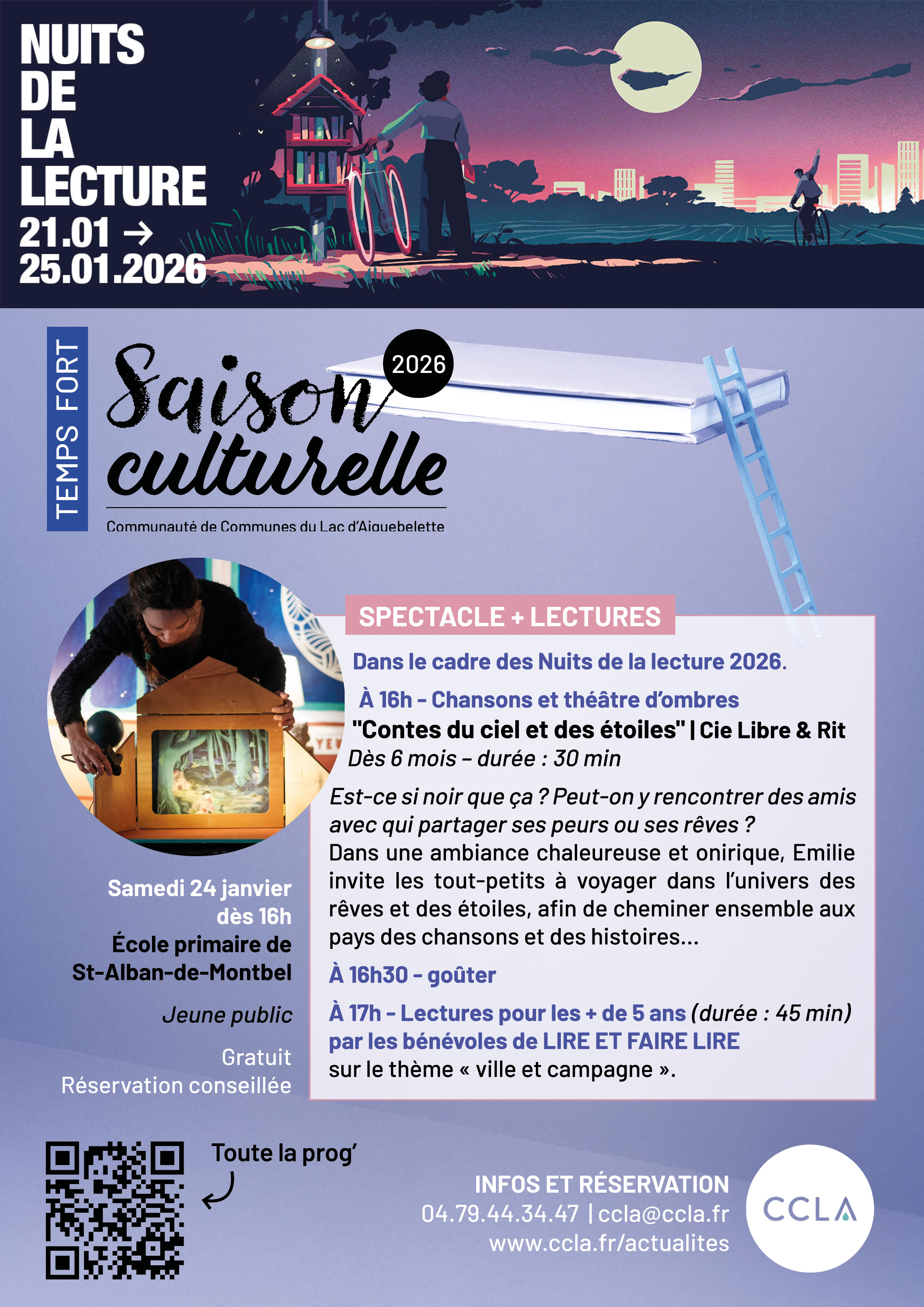 Dans le cadre des Nuits de la lecture, petits et grands sont invités à un moment chaleureux mêlant spectacle poétique autour des rêves et des étoiles, goûter convivial et lectures partagées. Une après-midi pour éveiller l’imaginaire et le plaisir de lire.