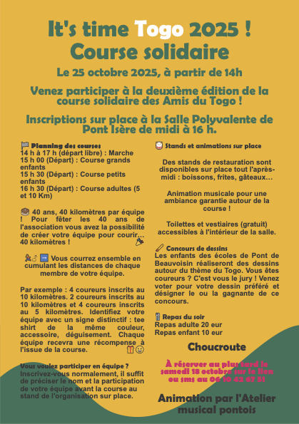 Course pédestre solidaire de 5 ou 10 Km. possibilité courir en équipe cumulant 40 KM, récompense. Course jeunes enfants et enfants 2 Km. Marche 7km. Animation musicale . Repas choucroute en soirée.