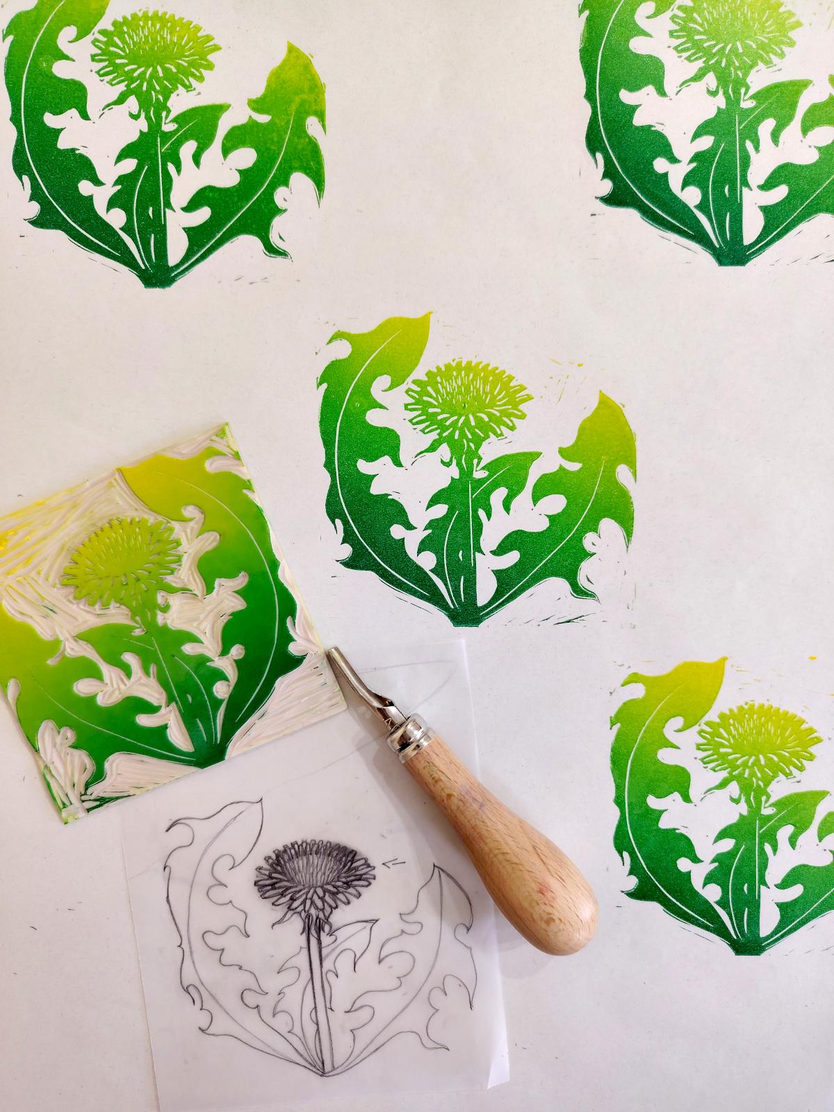Dessin d’une fleur, interprétation du dessin en aplats, gravure sur linoléum et impression sur papier à la presse, avec les couleurs et selon la disposition de votre choix.