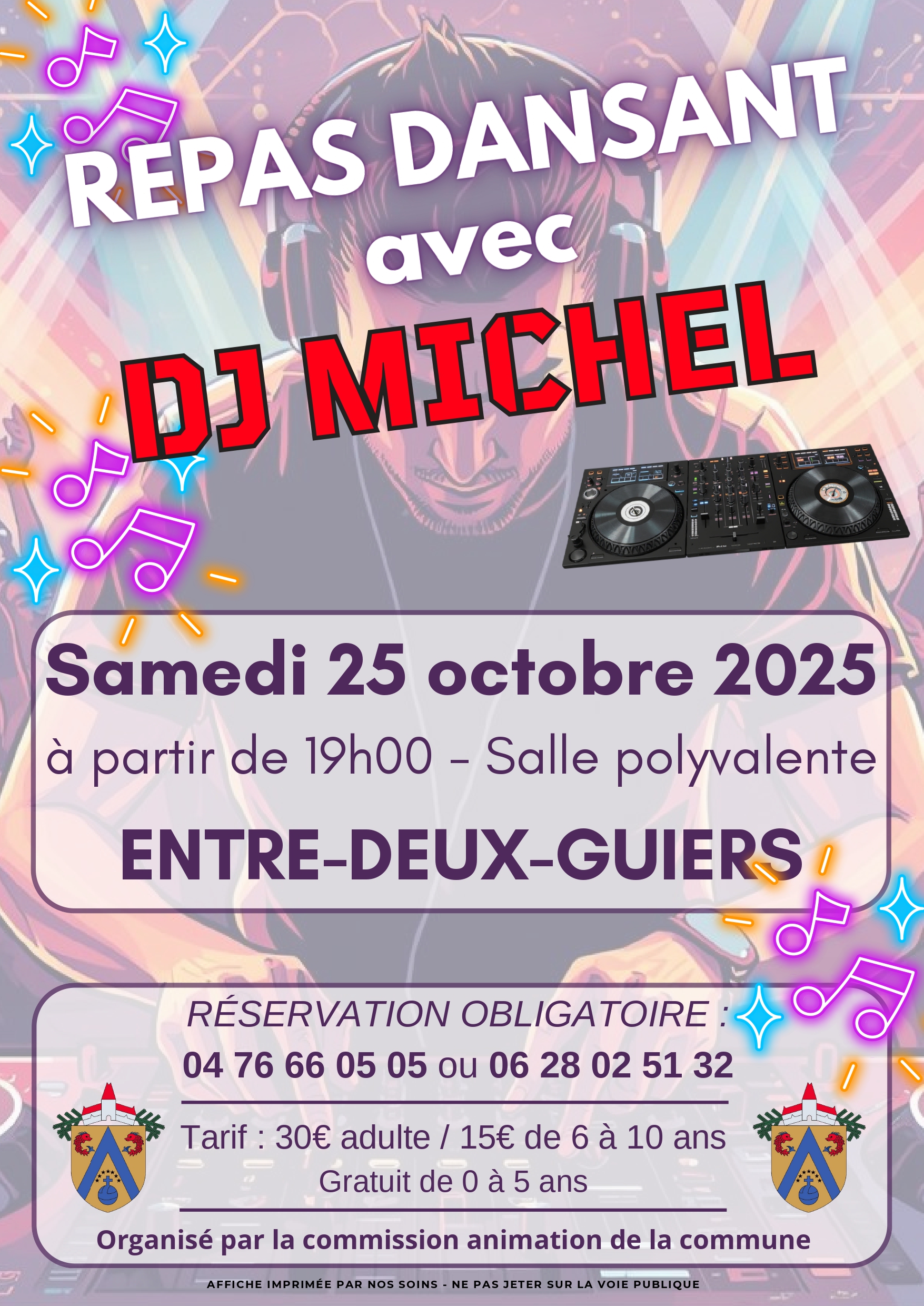 La commission animation de la commune d'Entre-Deux-Guiers organise son repas dansant. Au son de DJ Michel vous dégusterez un bon repas. Au menu : salade verte, rôti de veau farci sauce forestière et gratin dauphinois et dessert.