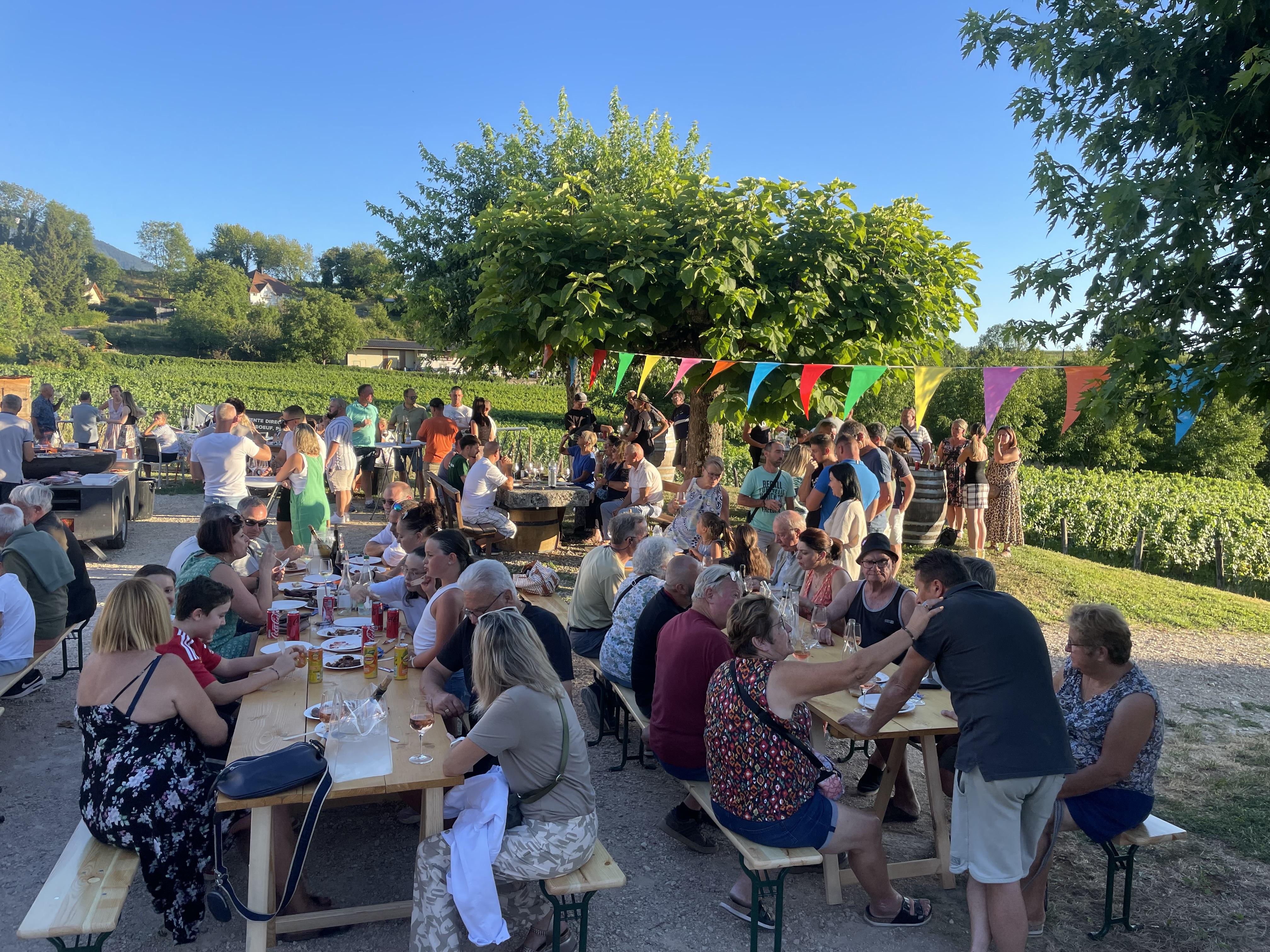 Venez partager un moment simple, convivial et festif, autour de bons produits locaux : vins (blanc, rouge, rosé, bulles), viande (porc, boeuf) et glaces artisanales. Tout cela, sur notre domaine, face aux vignes et au coucher du soleil. Esprit Guinguette familiale au rendez-vous !