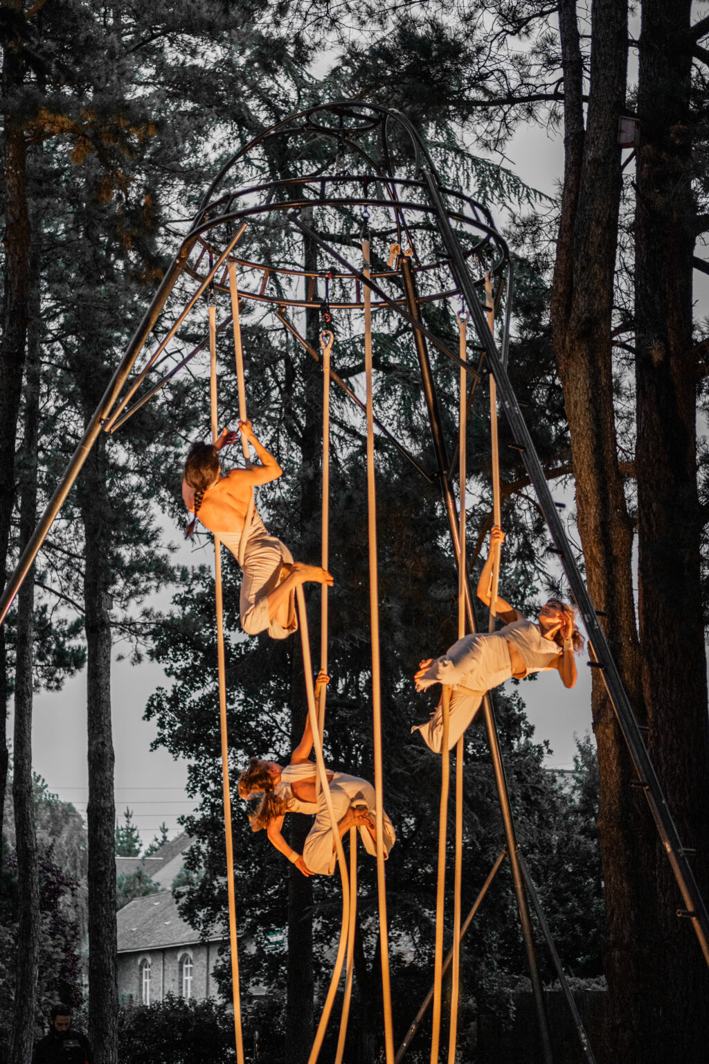 Trois femmes de la Cie l'Encordée évoluent dans les airs, entre leurs cordes de coton, avançant vers un monde où l’attention et l’écoute priment. Exaltées, accrochées par la taille, liées par l’audace, elles cheminent à travers les nœuds, hors les clous.