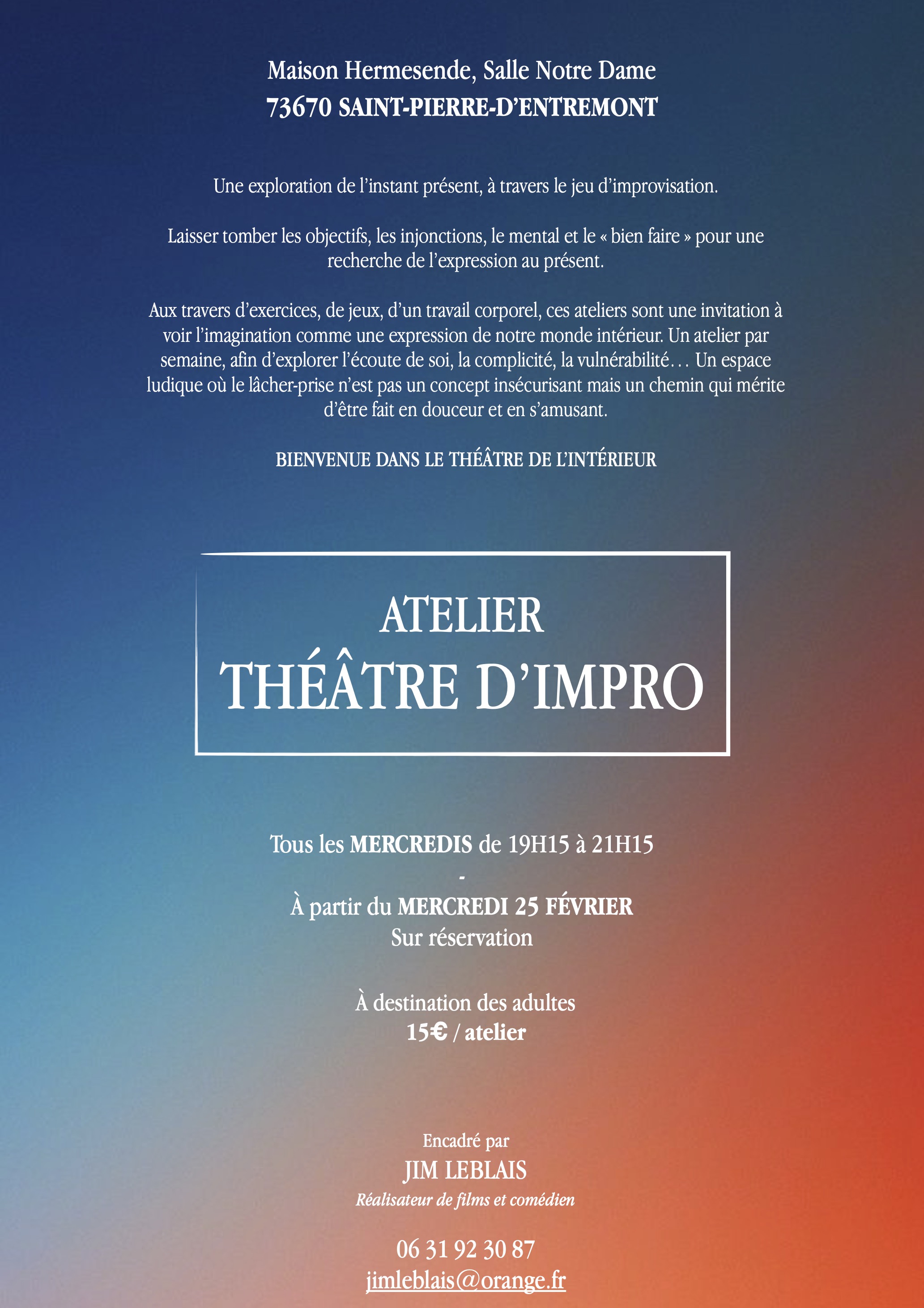 Aux travers d’exercices, de jeux, d’un travail corporel, ces ateliers sont une invitation à voir l’imagination comme une expression de notre monde intérieur. Un atelier par semaine, afin d’explorer l’écoute de soi, la complicité, la vulnérabilité... Un espace ludique où le lâcher-prise n’est pas un concept insécurisant mais un chemin qui mérite d’être fait en douceur et en s’amusant.